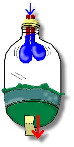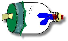 O.K., we're all done. Here's how it works. The bottle represents your chest, with the neck at the top and the lungs inside. The bag at the bottom represents your diaphragm, a flat tissue that moves up and down as muscles contract and expand. When your muscles pull it down, (simulated by pulling down on the cardboard), the chest cavity becomes larger, and the air pressure lowers. This causes your lungs to expand, all by themselves, just as the balloons will, as they fill with outside air.