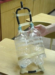 Wrap the lump of plasticine carefully around the two straws so they make an airtight seal. Attach two balloons to the straws as shown; tape them on securely. Then wedge the lump into the bottle top, sealing it carefully again. Now attach the piece of cardboard to the plastic bag with some duct tape.