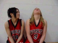 Janine can't keep from howling at a basketball game. Danielle looks worried ...