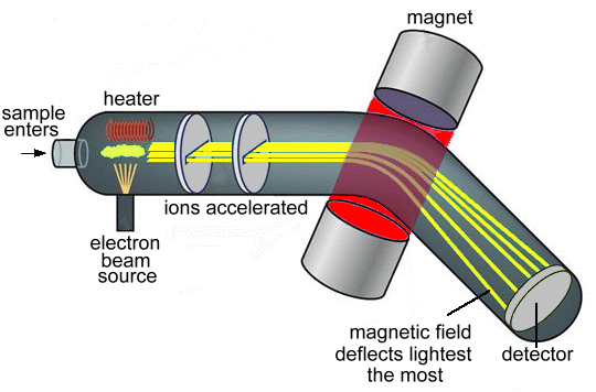 The ions are then deflected by a magnetic field according to their masses. The lighter they are, the more they are deflected. The amount of deflection also depends on the number of positive charges on the ion - in other words, on how many electrons were knocked off in the first stage. The more the ion is charged, the more it gets deflected.