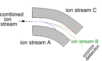 In the diagram above, ion stream A is most deflected - it will contain ions with the smallest mass/charge ratio. Ion stream C is the least deflected - it contains ions with the greatest mass/charge ratio.