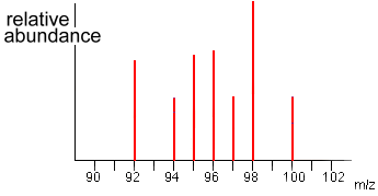 The commonest ion has a mass/charge ratio of 98. Other ions have mass/charge ratios of 92, 94, 95, 96, 97 and 100. That means that molybdenum consists of 7 different isotopes (atoms with differing numbers of neutrons in their nuclei).
