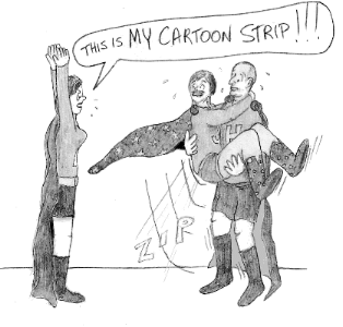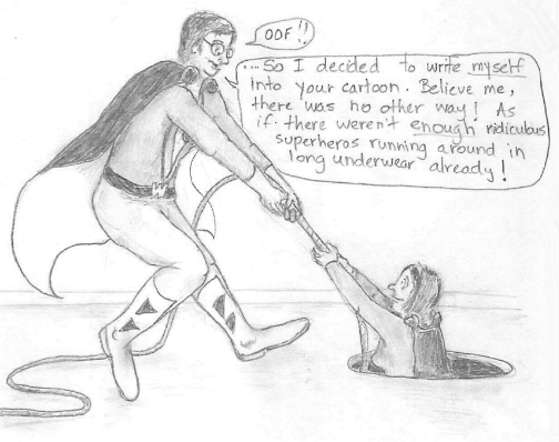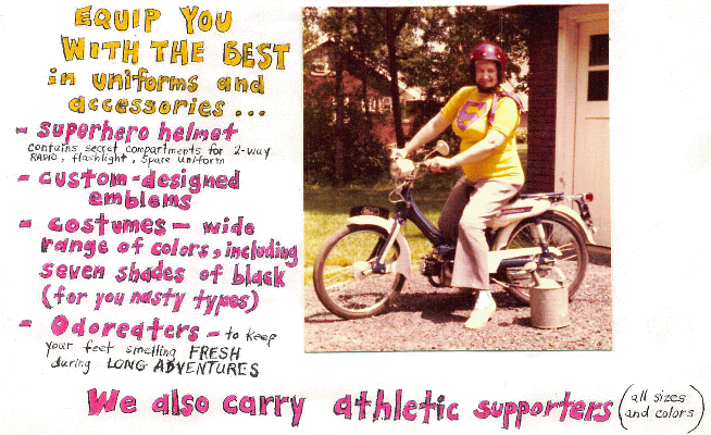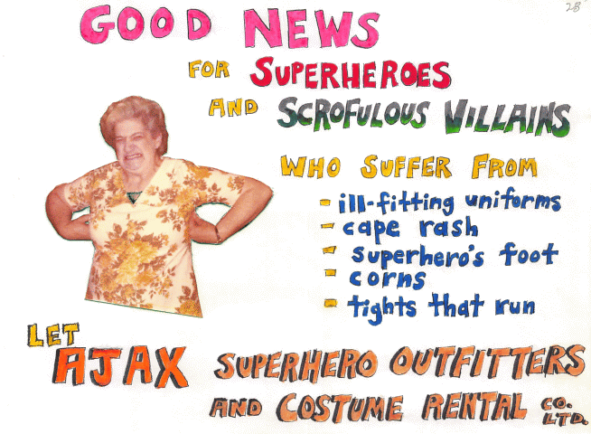 ![]() Play some intro music Go ahead. You need this. [When you get tired of it, right-click on the page and reload] Then play the incredible intro animation here That was fun, but it took way too long to set up. And yes, philosophy. Don't ask! I was a pretty prolific cartoonist everywhere I've been. In university the wall outside my residence room was covered with my creations, including a 'superhero' cartoon strip about my friends. Some of them got published in various places. At the same time I also produced the multi-page superhero strip about my sister entitled 'Armpit the Girl Wonder'. (More on that later). I did the same thing at the first school I worked at in Toronto, where I produced a recurring cartoon strip about fellow teachers, as well as illustrations for the monthly newsletter. When I moved to Worsley I did more cartoons. One recurring bit in that strip that stands out in my memory was a teacher who had a dog named Erin, a completely crazy and hyperactive Irish Setter that was dumb as a post. I named him 'Urine' in the strip. I also produced a monthly newspaper full of cartoons, jokes, fake articles and interviews, called The Polecat. Outside of school I created a monthly fake newsletter in the same vein, for friends, called 'The Worsley Farmer'. The centerfolds were a big hit. I also taught cartooning off and on for many years. Jr High students discovered that it was fairly easy to make a cartoon; the hard part was making it funny. Their humour tended to be along the lines of 'Oh look ... Bobby farted!'. Some of them are in the Yearbooks here. I also did an extensive set of single-panel cartoons about teaching and student teachers. Several of those were also published. Armpit the Girl Wonder was a strip about my family ... my mother, father, brother and sister Trish ('Armpit'). [Remarkably, she continued to speak to me after reading the strip!] ![]() (Witness the opening animation above). The rest of my family took it pretty well too, although I suspect my brother wasn't thrilled about the jokes about his moustache. My mother in particular was enthusiastic about the whole thing; she even volunteered to let herself be photographed 'in costume' to add some realism. ![]() ![]() Obviously my lettering skills left a lot to be desired in those days. I did eventually improve. ![]() At some point I'll digitize the full 'Armpit the Girl Wonder' cartoon strip and reproduce it here. ![]() In the meantime, let's get back to 'Tales of a Retired Math Teacher'! |