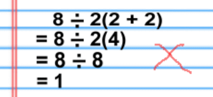 ![]() ![]() "I followed the order of operations" she said. "I did what's in the brackets in the first step, and then did the brackets first in the second step, multiplying 2 by 4". Fortunately I was visiting and was able to help. Her father could have helped, but he was at work. Her mother had been pretty good at math too, but she was busy in the basement cleaning up the remains of the chair that the dog had eaten. "Where did I go wrong?" Mildred asked me. "Brackets always come first, right?" I told her: "The problem is in this line": ![]() "In the order of operations, doing 'brackets first' means doing what's inside the brackets first". I pointed at the 4. "That's just a number now. It doesn't really have to be in brackets any more, although lots of people will still use them. "You know that in the first line there is an invisible multiplicaton sign between the 2 and the bracket?" I drew an arrow to show her. She agreed. ![]() "Once what's in the bracket is reduced to a single number, it can be multiplied. The line really looks like this." ![]() "The brackets don't have to be there". "So these are the same thing?" she asked me. ![]() ![]() "Yes. Which means you do division and multiplication in order, left to right". "Eight divided by two is four, times four is sixteen", she said, completing the problem correctly. I summarized it for her. "'Doing brackets first' doesn't apply when the brackets just contain a number. The brackets don't have to be there". She wrote out a correct solution. 8 ÷ 2(2 + 2) = 8 ÷ 2(4) = 8 ÷ 2 x 4 = 4 x 4 = 16 |