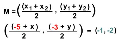 ![]() Finding an Endpoint Example 1: ![]() We've included a graph, but you won't always have one. Don't guess; the graph could be inaccurate, or the answer could be a decimal. We're going to use the midpoint formula, and then solve it backwards. ![]() ![]() where (-5, -3) is one endpoint, (x, y) is the other, and (-1, -2) is the midpoint. We now have two equations to solve: ![]() Here's a second example, without a graph: Example 2: "A line segment has midpoint (-3, 0.5) and one endpoint (-1, 5). Find the other endpoint". We'll call the missing endpoint (x, y) Write the midpoint formula backwards and fill in point (-1, 5) and the midpoint (-3, 0.5) ![]() |