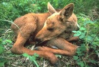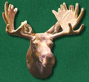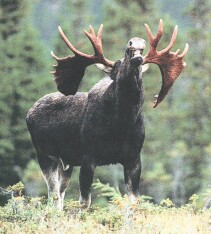 The moose is the largest member of the deer family, Cervidae. Its genus/species within that family is Alces alces, and there are subspecies of moose based on location: there is Alaska's Alces alces gigas, as well as the Canadian and American Alces alces americanus, and the European Alces alces machlis. Regardless of where they live, moose are herbivores, and ruminants, which means they eat vegetation (up to 10 kg per day) and digest it in multiple stomachs (four of them), regurgitating partially digested food to rechew it, like a cow. They are also crepuscular, which means they are most active at twilight. Height at the shoulders for an average moose is about 2 metres. Only the males have antlers, which are large and relatively flat. These antlers can have as many as 30 spikes, and their shape and distribution differs from animal to animal. Males, or 'bulls', shed their antlers once a year in early winter. New ones form in the spring; they're living tissue, nourished by blood vessels, and covered with a soft skin called 'velvet'. Eventually the inner tissue becomes a hard, bony extension of the skull, the velvet gets scraped off, and the antlers become solid and hard. Their main function is for display during the mating season (called the 'rut'), and dominance within the herd. Moose mothers are extremely aggressive, as are males in rut. Moose in general tend to be solitary animals, and if they travel in groups, it's usually ones with just a few adults. How much area a group of moose will claim depends on the availability of food and the climate, as well as the nature of the terrain. In Newfoundland, where the density of moose is as high or higher than anywhere else in the world, there are an average of 6 to 8 moose per square kilometre of woodland. That's a lot of moose! Other than man, who kills moose for sport, for meat, and by accident on the highways, the moose's main predator is the wolf. The wolf's constant attention keeps the moose herds healthy, by killing the weak and injured ones. Unless overhunted, moose do very well in the wilderness areas of North America. In fact, in many areas, hunting is a necessary measure to keep moose populations in check. Moose are not native to Newfoundland, for example; four were released in 1904 to supplement dwindling caribou herds, (Canadian Geographic, December 2000), and there are now an estimated 125,000 to 150,000 moose in that province! Moose on the highways in wilderness areas of North America pose a definite hazard, and are responsible for a lot of damage to vehicles and injuries to people, resulting in substantial repair and health insurance costs in some regions. Possible solutions that have been proposed include planting the sides of the road with vegetation that moose do not like to eat, and spraying the shoulders of the road with artificial wolf urine.