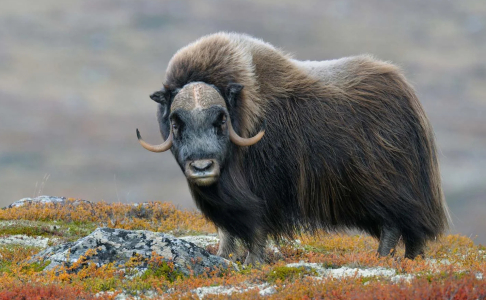 The herds move more often when cows are lactating, to let them get enough food to nurse their offspring. Cows have an eight- to nine-month gestation period, with calving occurring from April to June. Cows do not calve every year, often missing a year when winters are severe. Calves can keep up with the herd within just a few hours after birth. The calves are welcomed into the herd and nursed for the first two months. After that, a calf begins eating vegetation and nurses only occasionally. Cows communicate with their calves through braying. The calf's bond with its mother weakens after two years. Muskoxen are sometimes kept domestically for their wool, and occasionally for meat and milk. The U.S. state of Alaska, for example, has several muskoxen farms specifically aimed at wool harvesting. The wool, called qiviut, is highly prized for its softness, length, and insulation value. A muskox can reach speeds of up to 60 km/h. Their life expectancy is between 12 and 20 years. The primary predators of muskoxen are arctic wolves. Other occasional predators, likely only of calves or sick adults, can include grizzly bears and polar bears, as well as wolverines. If there are many predators, such as a pack of wolves, muskoxen form a defensive circle. Adults stand shoulder to shoulder facing the threat, with the young inside the circle. Both sexes have horns, which they point towards the threat. ![]() Muskoxen are not known to be aggressive. Fatal attacks are extremely rare, but humans who have come close and behaved aggressively have occasionally been attacked. Some information obtained from Wikipedia |