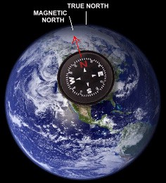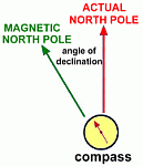 ![]() ![]() The true north pole on Earth is the north point of the axis around which the Earth rotates. This axis is tilted about 23° in relation to Earth's orbit around the sun; that's what causes the seasons. The axis currently points almost directly at a star called Polaris. Because it does, when you find it in the sky (in the northern hemisphere) you will be looking in a direction that is almost directly north. Using the north star as a guide, you can always tell which way is north. Polaris has not always been the 'North Star', and won't be, in the future. The Earth spins on its axis just like a gyroscope, and 'precesses' as it spins ... the rotational axis slowly changes direction, in a circle, over thousands of years. Currently it points within one degree of Polaris. During the past 5000 years the axis has pointed at the star Thuban (Alpha Draconis); in the year 7500 the North Star will be Alpha Cephei; in the year 15,000 it will be the star Vega. About 9000 years after that, Polaris will again become the North Star. ![]() ![]() Imagine you are standing at point Q. The angle shown in the picture represents your latitude, in degrees, above the equator. (For simplicity, we've shown the Earth here without its 23° tilt). ![]() Now look at the diagram at the left. You're still at point Q. We've shown the horizon line; everything you can see in the night sky is above this. Now notice the two arrows pointing towards the north star. One is pointing towards Polaris from your position at Q. The other is the axis of the Earth, which also points at Polaris. (These lines are virtually parallel, even though they're pointing at a star, because the star Polaris is so far away). Your latitude is shown by the angle 1. The altitude of Polaris above your horizon is shown by angle 2. We're going to use geometry to prove that angle 1 and angle 2 are the same. Because the two arrows pointing at Polaris are parallel, there is a pair of corresponding equal angles (an 'F' pattern). These are angles 4 and 3. Angle 4 equals angle 3. Angle DOX is 90° (because it's the angle between north and the equator). Angle BQG is 90° (because it's the angle between your horizon and zenith). Since Angle 4 equals angle 3, then the left-over portions of each 90° angle must also be equal: ie: angle 1 equals angle 2. In other words, your latitude angle equals the altitude angle of Polaris above your horizon. This means that wherever you are in the northern hemisphere, when you look up at the sky and find the north star Polaris, you'll know two things: which way is north, and your latitude. Now let's look at what happens when you use a compass. ![]() The Earth's magnetic field is shaped approximately like that of the bar magnet (shown at the right) and, like a magnet, it has two magnetic poles, one in the Canadian arctic and one off the coast of Antarctica. Earth's magnetic north pole is where the magnetic field lines are oriented vertically, and plunge into the surface of the Earth. This location is near the true north (axis) pole, but not not right at it. It's about 960 km away. ![]() ![]() To solve this problem they use maps that show the declination angle ... the angle between magnetic and true north, for the spot they are at ... and correct their heading to account for the error. They also use a special compass that will make the correction for them. It should be clear from the diagrams above that the farther north you go, the greater the declination angle, and the greater the error. This makes flying a plane in the arctic a little more difficult, as you always must adjust your heading for true north to make up for the compass error ... and the correction changes as you change locations! Special maps are available that show the declination angle for your current position. However, pilots today don't have to rely on just a compass to find their direction. Global Positioning Satellites (G.P.S.) will report your exact location, and aren't affected by where the north magnetic pole is in relation to where you are. Incidentally, when you're right at the north magnetic pole, where does your compass needle point? Well, it tries to point straight down ... but since it can't, it just spins in circles. There is in fact a special type of compass called a 'dip compass', where the needle is free to dip downwards. You can use it to measure how close you're getting to the north magnetic pole. ![]() Currently it is moving roughly northwest, at approximately 40 km per year. Scientists are constantly checking on its position, but because its location is now in the Arctic Ocean, they can only visit the location briefly each spring. The magnetic pole is drifting away from North America so fast that it could end up in Siberia within 50 years. Because the magnetic pole is moving, maps showing the 'declination angle correction' quickly become outdated; new maps are prepared every so often to allow for the new position of the magnetic pole. The reason the magnetic pole is moving is not well understood. It may have something to do with the movement of the molten outer core inside the planet due to convection currents within it, and the fact that its density is not uniform throughout. Wait ... there's more! The location of the pole is moving, but as it moves, it also wanders around! On any given day, it can be up to 80 km away from where you think it is. This wandering is due to disturbances in the Earth's magnetic field, perhaps caused by particles from the sun hitting the magnetic field lines. These same particles cause the Northern Lights. If the north magnetic pole does end up in Siberia in this century, Canada and Alaska could lose their northern lights! |
