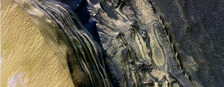 Bright deposits of water ice alternate with bands of dark sand, descending from the left into a 610 metre deep canyon. The layers accumulated over millions of years, and will help scientists to piece together the history of climate change on Mars.