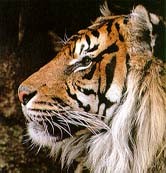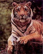 The tiger (Panthera tigris) is the largest of all cats, and one of the most fearsome predators in the world. A typical male Siberian tiger may weigh 230 kilograms (500 pounds), and measure more than three metres from its nose to the tip of its tail. Tigers roam over large distances, and can leap up to 9 metres in one jump. Tigers are at the top of the food chain: they eat just about anything, and nothing eats them. They have been known to eat crocodiles, fish, birds, reptiles, and even other predators like wolves, leopards and bears. However, to remain healthy they must include hoofed animals such as deer in their diet. The biggest prey animals, such as water buffalo, provide so much food that the tiger won't hunt again for a week. More than 36 kilograms (80 pounds) of meat may be eaten at one sitting. Hunting is often difficult, however, and tigers are only successful in one or two attacks out of every twenty. Tigers are usually solitary, and come together only to mate. Gestation lasts about three and a half months. Two or three cubs are normally born, inside a den made from thick vegetation, a cave, or a rocky crevice. Mother tigers nurse for three to six months, although the kittens may begin eating meat as early as two months old, and can hunt by the time they're one year of age. Cubs l stay with their mother for about 2 years. About half of all cubs survive to their third year. Male tigers roam a large territory, the size of which depends on the terrain. In Russia, territories may be as large as 1000 square kilometres, while a male tiger in India may occupy 100 square kilometres or less. Tigers mark their territories with urine, feces, and scratching on tree trunks. Tigers are Endangered: North American and Western European countries also are contribing to the killing of tigers; according to one recent investigation, 41% of traditional medicine shops surveyed in the U.S. sold medicines labeled as containing tiger or rhino parts. The last hundred years have seen major losses of wild tigers. By the 1950s, tigers living around the Caspian Sea were extinct. Populations of tigers that once inhabited the islands of Bali and Java are now extinct. The last Bali tiger was killed in 1937; the last Javan tiger sighting occured in 1972. India today has the largest number of tigers, with between 3,000 and 4,800. The South China tiger, with at best 20 to 30 individuals, is nearly extinct in the wild. The remaining wild tigers are threatened by many factors, including growing human populations, loss of habitat, illegal hunting of the tiger and the species they hunt, and a growing trade in tiger parts for traditional medicines. The World Wildlife Fund and many other organizations are now working to combat these threats, to try to save the tiger. You can help by visiting their website and making a monetary contribution. |