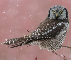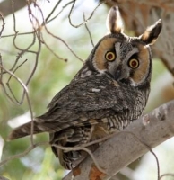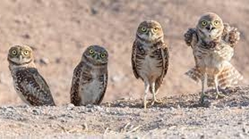 ![]() Owls are carnivorous, nocturnal birds of prey. Owls' eerie hoots and calls at night often make them seem mysterious. Sixteen of the world's 146 species of owl can be found in Canada; we'll examine all sixteen of them here. No owl builds its own nest; some will cobble together a few sticks. Canada's best-known owl, the Great Horned Owl, usually takes over the discarded nest of a red-tailed hawk. Great Horned Owls will also use an artificial platform or even a ledge in a barn. That's also where you'll find Barn Owls, but only in southern parts of Ontario and British Columbia. ![]() Owls hunt mostly small mammals, insects, and other birds, although a few species specialize in hunting fish. They are found in all regions of the Earth except the polar ice caps and some remote islands. When owls group together, it's called a 'parliament' of owls. In most species, the smaller adult male feeds the female who is incubating the nest. Incubation begins as each egg is laid. Because it can take food away from younger nestlings, the oldest owlet is well fed even when prey populations are low. With severe famine, the parent owl may feed the smaller owlets to its larger nestmates. Owls are downy at hatching, and most species remain in or near the nest until they are able to fly. Owls have large, forward-facing eyes and ear-holes, a hawk-like beak, a flat face, and usually a conspicuous circle of feathers around each eye. The feathers making up this disc can be adjusted to sharply focus sounds from varying distances onto the owls' ear cavities. Most birds of prey have eyes on the sides of their heads, but the stereoscopic nature of the owl's forward-facing eyes permits the greater depth perception necessary for low-light hunting. Owls can rotate their heads up to 270°. Although owls have binocular vision, their large eyes are fixed in their sockets, as with most other birds, so they must turn their entire heads to change views. Owls are actually farsighted, being unable to clearly see anything within a few centimetres of their eyes. However, their far vision, particularly in low light, is exceptionally good. ![]() Owls’ feathers are generally larger than the average birds’ feathers. The surface of the flight feathers is covered with a velvety structure that absorbs the sound of the wing moving. This maximizes the owl's ability to silently fly to capture prey without the prey hearing the owl coming. An owl's sharp beak and powerful talons allow it to kill its prey before swallowing it whole. They regurgitate the indigestible parts of their prey, such as bones, scales, and fur, in the form of pellets. These 'owl pellets' are often sold by companies to schools for dissection by students as a lesson in biology and ecology. An owl’s supposed wisdom is based on the shape of its face and large eyes, and its ability to turn its head to stare, giving the impression of undivided attention. However, it isn’t among the social birds, which are considered intelligent. These include crows, starlings and house sparrows, which have all shown problem-solving ability, and parrots, which can associate words and phrases with objects and events. Many social birds have a wide vocabulary, including calls for certain predators. Some even learn to fool their rivals by imitating predators’ calls to scare other birds away from food sources. Owls, however, don't have relatively large, well-developed brains like these social birds, don't exhibit curiosity, and when tested in captivity haven't shown above-average intelligence. Owls in Canada ![]() These owls are 35–50 cm tall, with a weight of 460 gr (1 lb). They're crow-sized with a white, heart shaped face, dark eyes and long legs. They can be found in coastal British Columbia south of Vancouver, as well as in southern Ontario, and many other places in the world; they are the most widely distributed owl in the world. Mice make up 75% of their diet. Barn Owls are strictly nocturnal, roosting during the day in cavities or farm buildings. Pairs of Barn Owls mate for life. They don't build a nest, but lay 5 to 10 white eggs directly on the floor. Their call is a long, hissing shriek. They have a lifespan of up to 17 years. ![]() The Barred Owl is 42–60 cm tall, with a weight of 720 gr. They can be found in British Columbia, northern Alberta, Saskatchewan and southern Manitoba through to the Maritimes. They are gray-brown with a cross-barred neck and breast, a streaked belly, and dark eyes. They don't have ear tufts; they're often called ‘hoot owls’. They are active day or night, and can hear the squeak of a mouse from 46 metres away. Barred owls often drink and bathe in open water, even in winter, and have been seen wading into water to catch fish. Its voice is a strong 'hoo hoo ho-ho'. Both sexes incubate the two to four white eggs laid in a tree cavity. Their lifespan is up to 23 years ![]() These owls are 20–30 cm tall, and weight 135 gr. They can be found in B.C. and across northern Canada. They are also called ‘Richardson’s Owl’ or the ‘Sparrow Owl’. Boreal Owls are brown with white spots above, and a rust-streaked breast, heavily spotted forehead, and a yellow bill. A dark ‘V’ pattern on their face creates an angry expression, Boreal owls do not have ear tufts. They are nocturnal, roosting in thick cover during the day. They're fearless of man; the Inuit thought their ease of being captured was because they couldn’t see in daylight. They use old woodpecker holes for nesting, laying four to six white eggs. Sometimes they will shelter in old barns. They prey on small rodents, birds and insects. Their lifespan is up to 15 years. Hear a Boreal Owl. ![]() Burrowing Owls are 23 - 27 cm tall, and weigh 155 gr. They can be found in Southern Alberta and Saskatchewan. They're a robin-sized, ground dwelling owl with long legs, a short tail and yellow eyes. They also have no ear tufts; their face is framed in white with a blackish collar. They are usu