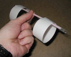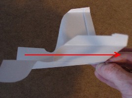 ![]() We also have a few designs you can try, with photographs and instructions. Making Your Airplanes Go Farther The best design for distance is a dart, as shown at the right. You should fold the wings towards the centre several times in order to make them very stiff, and use some tape at the top to hold them together. If the wings are stiff and a paperclip is added for balance, the distance your plane will travel is limited only by how fast you can throw it! Try experimenting with smaller darts made from stiff cardboard. you can launch them with an elastic band and make them travel 100 metres or more! Another interesting design that will travel long distances is the one shown below. In order to minimize drag, (the force of air friction) almost all of the non-wing parts are missing. This airplane is almost all wing! This design won't go as far as a dart (it can't be launched at the same high speed), but the distance it does travel will amaze you. Just fasten two loops to a straw ... the one in front should be slightly smaller. Make sure the loops point in the same direction. A paperclip adds balance. Making Your Airplanes Stay Up Longer and Do Tricks The airplane is made from a single sheet of paper. The wings don't have to be stiff, because you will launch it very slowly. Curved edges on the wing give it a lot of lift, and by changing their curvature, and the symmetry of the plane overall, you can make it turn and do loops. This design is called the 'Barnaby Flyer'. It was invented by Capt. Ralph S. Barnaby, USN (Ret), and it first appeared in his book "How to Make & Fly Paper Airplanes" (Scholastic Book Services 1968). The size and shape of the various parts of this plane are not critical. You don't have to measure anything, or cut especially carefully. We've even made one fly that we ripped out by hand, rather that cutting it out carefully with scissors. Begin by folding over the long edge of a sheet of paper continuously, until you almost reach the middle. Then crease and fold the sheet inwards (so the folded edge you just made is on the inside). Lay the folded paper flat, and trace the above design on one side. After cutting, the plane should look like the picture above left. Now fold the tail wings so that the angle of the fold makes an imaginary line to somewhere out in front of the nose, shown in the middle picture above. The next step is to put a curl on the main wings. Curl the edges downward with your finger. Try to make them curl smoothly, and identically on both wings. Examine your plane for symmetry. If the two sides aren't identically shaped, and identically positioned, the plane won't fly straight. The plane is launched slowly by pulling it forwards from the front, shown above right. After some experimenting, you should be able to get the plane to fly straight. Now try some aerobatics! If you change the curvature of the wings, vary the direction of the folded-up wingtips, and remove some of the symmetry, the plane can be made to do all sorts of turns and loops! |