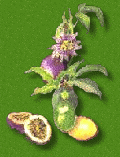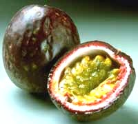 The fruit is also grown in other places, including Hawaii. Passion fruit is round and about 7 cm in diameter. Its colour ranges from dark purple to light yellow. The dark skin becomes brittle and wrinkled when it's ripe. Inside, the yellowish, jelly-like pulp has a lemony, tart flavour, and contains many small, black edible seeds. The juice is used to top ice cream, other soft fruit, or in fruit drinks. Passion fruit juice may be cooked for use in sauces and fillings. The pulp makes a delicious jam or jelly, and the seeds add a unique crunchy texture. Passion fruit is high in fiber, and low in sodium. It also contains much vitamin B, C and iron. Most Hawaiians prefer the yellow variety, and it is often grown in backyard gardens there, but the vine quickly climbs trees, spreads, and becomes a pest. |