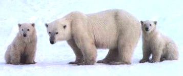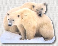 Adult male polar bears weigh on average 1000 pounds, and can weigh up to 1500 pounds. females are considerably smaller, normally weighing up to 500 pounds. An adult polar bear's only enemies are humans, and occasionally other polar bears. In the wild, adult polar bears live an average of 15 to 18 years, though biologists have found a few that have lived to 30. In zoos, many captive bears live until their late 30s. The polar bear's diet consists mostly of the ringed seal. In winter, polar bears capture these seals by waiting near the seal's breathing hole. When the seal comes up for air, the polar bear grabs it. In summer, the bears sneak up on seals while they're sleeping on the ice ... the bear crawls slowly forward when the seal sleeps, and freezes in place when the animal raises its head. When close enough, the polar bear pounces, killing the seal before it can escape back into the sea. When a polar bear is sneaking up on a seal, it will often get down low to the ice so that its white fur blends in with the snowy background. The only part of the bear the seal can clearly see is its black nose ... which the seal mistakes for another seal far away. The polar bear is the only bear to be considered a marine mammal. Polar bears spend as much time on the ice and in the water as they do on land, and are excellent swimmers; they have been known to swim over 50 miles, at the sedate speed of six miles per hour. A polar bear's front paws are partially webbed and very large, to help it swim better. Fur between the pads help the bear sneak up quietly on its prey. The polar bear's fat layer, which is three to four inches thick, not only protects it from the cold, but gives it buoyancy in the water. Polar bears use their layer of fat to protect them from the cold air and cold water. Walrus, whales and seals also have layers of blubber, which help to keep them warm. The polar bear's fat layer is 4-5 inches thick, and is so effective that adult males quickly overheat when they run. Here's an interesting experiment you can do, to learn how good an insulator fat is ... visit our blubber experiment page. Because of their well-insulated body, polar bears give off no detectable heat; ... they don't even show up in infrared photographs. (Infrared film measures heat.) When a scientist attempted to photograph a bear with such film, he produced a print with a single spot ... the puff of air caused by the animal's breath! The bear's fur also helps keep it warm in an unusual way. Younger bears have fur that looks white (because of the refraction of light), but is actually translucent. Individual hairs act as 'light pipes', conducting light energy down to the skin, which is dark. As bears age, the fur begins to take on a slight yellowish colour due to continued exposure to sunlight. A female usually has two cubs. The mother gives birth to her cubs about two months after she enters the den in the fall. Newborns are about a foot long. Half of all cubs die in their first year, due to starvation, killing by hunters, or accidents. Polar bear cubs drink their mother's milk for almost 2 years, and depend on her for survival. As with most bears, the male may kill the cubs, although highly protective mothers are capable of driving off much larger males. Polar bears have distinct territories; a polar bear's home range can be enormous, far greater than that of any other bear. A single polar bear may rove across an area twice as big as the country of Iceland. Young polar bears may travel more than 1,000 kilometers (600 miles) to set up a home range apart from their mother's. However, there are distinct groupings of polar bears in the arctic regions around the world, and bears tend to stay within their own group's region, near their denning areas and the seals. The polar bear's sense of direction is phenomenal, and quite mysterious. It can unerringly find its way across the ice of frozen seas that are constantly breaking up and refreezing, and where there can be no recognizable landmarks. The polar bear, like brown and black bears, does not truly 'hibernate'. Though their heart rate slows, their body temperature does not drop dramatically, and while they may sleep, they have no difficulty waking up. Though brown and black bears sleep in winter, male polar bears do not. Only pregnant females spend the winter sleeping in a den, a two-chambered tunnel scraped into the snow. The female gives birth to her cubs late in the year. Polar bears are very intelligent, which can be seen in the various ways they stalk seals. A bear may drift in the water toward a seal on an ice floe, with only its head visible, mimicing a chunk of ice; when it gets close enough, it leaps out of the water and hits the seal with a paw. Polar bears have been observed to scrape the ice layer at a seal's breathing hole until it is paper thin, and then lie on top of the hole to simulate snow cover; the unsuspecting seal will surface right under the bear. Bears will also build a snow wall to hide behind as they wait for a seal to surface at a hole. Polar Bear Survival: Polar bears are a potentially threatened species. Because they live in and move through more than one country in the north, there is no single protection scheme to keep their numbers safe. In Norway, polar bears are completely protected, but scientists are worried about the effects of pollution on the bears. PCB levels in the polar bears of Norway and western Russia are two-and-a-half to seventeen times higher than those in North American populations. In Canada, Hudson Bay's ice melts about three weeks earlier each spring than it did just 25 years ago, which has greatly shortened the time that the bears can hunt for food. (Polar bears need a platform of ice from which to hunt seals.) Canadian scientists have observed that today's polar bears are smaller in stature, weigh less, and have fewer cubs. The bears in certain areas of Canada have excessive levels of PCBs and other contaminants. Native hunt