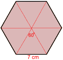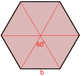 ![]() Page Three ![]() Here we have six triangles, so each central angle is 60°. The triangles are all equilateral. From page one, we know the formula for the area of an equilateral triangle: A = √3b2/4 So the formula for a regular hexagon must be: A = 6√3b2/4 A = 3√3b2/2 Area of a regular hexagon with sides b: A = 3√3b2/2 ![]() Let's try an example with sides 7 cm: A = 3√3b2/2 A = 3√3(7)2/2 A ≈ 127.3 cm2 Now let's move on to regular polygons with eight sides >>> |