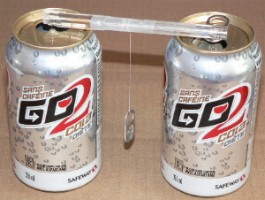 ![]() ![]() The items you'll need are shown at the left. They include the two pop cans, a pull-tab from one of the cans, tape, a sheet of aluminum foil, a short length of thread, a barrel from a cheap ballpoint pen, and two pieces of coated wire each about 30 cm long. We used wire test leads with alligator clips at the ends to make it easier to attach the wires, but if you don't have any of these, you can attach the wires with the tape. You'll also need access to an older television, since it's going to provide the power for our motor. Don't worry ... this is not a dangerous project. ![]() ![]() ![]() The pictures above illustrate how to build the motor. Begin by removing the innards from the pen barrel, and taping about 5 cm of thread to the middle. Tie the other end of the thread to the pull-tab. With the two pop cans side by side, about 7-8 cm apart, lay the pen across their tops so the pull-tab hangs down half-way between, at about the middle of the cans. Attach one of the wires to the top of the can on the left. Attach the other wire to the top of the can on the right. Then fasten the other end of the right wire to the edge of the piece of aluminum foil. Now move the whole setup to the top of your TV, and press the foil smoothly to the screen of your television. (It's easier if the TV is off when you do this). Hold the left wire in your hand ... your body will act as a ground. Turn on the TV. The pull-tab will begin to move back and forth, making a clicking noise as it hits the can on each side. Your motor is running! Here's how it works. ![]() The aluminum foil spread over the screen collects this voltage, and sends a current of electrons through the motor and into your body. You won't feel anything. (Although it's high voltage, the current is quite small ... similar to the current in a static electric shock you get by scuffing your feet on a carpet and touching someone). Both cans become negatively charged because of the excess electrons. The pull-tab remains neutral because it is insulated from the current by the pen barrel. The negative charge on the right can repels the electrons that are in the pull-tab. These can't escape the pull-tab, but they move to the side away from the right can, leaving the side of the pull-tab closest to the right can positively charged. The pull-tab is then attracted toward the right can. When the pull-tab touches the right can, extra electrons from the can jump onto the pull-tab. This makes the pull-tab negatively charged too. Now it's repelled from the right can. Now the negatively charged pull-tab is moving toward the left can, which is also negatively charged. The negatively charged pull-tab repels electrons from the surface of the left can, which becomes positively charged. It now can attract the pull-tab. When the pull-tab touches the left can, the excess electrons jump off the pull-tab onto this can. This leaves the pull-tab neutrally charged, so it is free to swing back ... and then the process begins all over again. The motor will continue to run as long as the TV is left on to act as a source of electrons. Although the current involved is similar to a static electricity charge, we discovered that touching the foil or the cans while the motor is running, or even afterward, results in quite a large shock ... not dangerous, but certainly startling. |