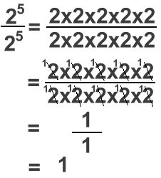 The 'Zero Exponent' rule is really easy, but you will have to memorize it, because it does not seem to make sense! Here it is: Simple rule, right? But consider what it really means: "When you multiply 5 by itself NO times, you get 1. How can you multiply something no times, and why should you get 1 when you do? Like we said, it seems nonsensical! Nevertheless, that's the rule! And it does follow logically from the rules we've already looked at! Have a close look at this question: By writing out all the 2's, and reducing the fraction, we end up with answer 1. But let's do the same question using the Quotient Rule: (subtract the exponents) We got two different answers, but they must be the same thing! Here are a few questions to try: this time, just say the answer to each to yourself: 60 = ? That's right ... all the answers were 1. "Any base with exponent zero gives an answer of 1." Next is the 'Negative Exponent' page. Zero Exponent | Negative Exponents |