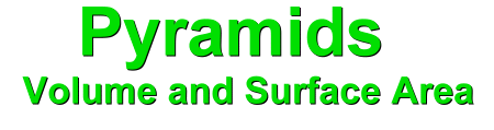 ![]() Rectangle Base Pyramids: Volume ![]() The volume of a rectangular prism is given by the formula V = L·W·H A rectangle base pyramid has one third of the volume, so its volume is given by the formula V = L·W·H ÷ 3 The height will often be shown inside the pyramid. ![]() V = L·W·H ÷ 3 V = 7·8·12 ÷ 3 V = 224 cm3 - Which you call length or width doesn't matter. - A square base pyramid would use the same formula. ![]() Find the height rounded to 1 d.p. V = L·W·H ÷ 3 410 = 5·5·H ÷ 3 410 ≈ 8.33·H 49.2 mm ≈ H We used the convention that says: "for an answer rounded to 1 d.p., carry 2 d.p. until the last step". ![]() Find the sides of the square base. V = L·W·H ÷ 3 711 = x·x·20 ÷ 3 711 ≈ 6.67·x2 106.60 ≈ x2 10.3 cm ≈ x Another common convention is to assume rounding to 1 d.p. if the question doesn't specify. Triangle Base Pyramids: Volume ![]() The volume of a triangular prism is given by the formula V = (b·h ÷ 2)·H A triangle base pyramid has one third of the volume, so its volume is given by the formula V = (b·h ÷ 2)·H ÷ 3 or V = (b·h·H) ÷ 6 Notice the difference between 'H' and 'h'. ![]() Example 4: Find the volume V = (b·h·H) ÷ 6 V = 8·12·10 ÷ 6 V = 160 cm3 |