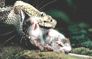 A Timber Rattler strikes a mouse, burying its fangs in the body.
