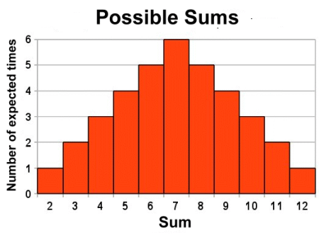 But his will be a lot of work; you'll need to roll the dice at least a thousand times to get a clear idea of how often each sum comes up. So we did the work for you. Before we look at the results, let's go over exactly what's happening: What happens if we roll two dice? We want to know what the sum of the two dice will be. All sums in between two and twelve are possible. How many different combinations are there? Here's a summary of all the possible combinations: 2 - 1 2 - 2 2 - 3 2 - 4 2 - 5 2 - 6 3 - 1 3 - 2 3 - 3 3 - 4 3 - 5 3 - 6 4 - 1 4 - 2 4 - 3 4 - 4 4 - 5 4 - 6 5 - 1 5 - 2 5 - 3 5 - 4 5 - 5 5 - 6 6 - 1 6 - 2 6 - 3 6 - 4 6 - 5 6 - 6 There are 36 different possible combinations of the two dice. Based on this table, which lists all the possible combinations which could theoretically occur, let's look at some theoretical probabilities. A sum of two happens 1 time in thirty six possibilities. Thats 1 out of 36, or 2.8% of the time. A sum of three happens 2 times in thirty six possibilities. Thats 2 out of 36, or 5.6% of the time. A sum of four happens 3 times in thirty six possibilities. Thats 3 out of 36, or 8.3% of the time. A sum of five happens 4 times in thirty six possibilities. Thats 4 out of 36, or 11.1% of the time. A sum of six happens 5 times in thirty six possibilities. Thats 5 out of 36, or 13.9% of the time. A sum of seven happens 6 times in thirty six possibilities. Thats 6 out of 36, or 16.7% of the time. A sum of eight happens 5 times in thirty six possibilities. Thats 5 out of 36, or 13.9% of the time. A sum of nine happens 4 times in thirty six possibilities. Thats 4 out of 36, or 11.1% of the time. A sum of ten happens 3 times in thirty six possibilities. Thats 3 out of 36, or 8.3% of the time. A sum of eleven happens 2 times in thirty six possibilities. Thats 2 out of 36, or 5.6% of the time. A sum of twelve happens 1 time in thirty six possibilities. Thats 1 out of 36, or 2.8%% of the time. Here's the result in chart form: ![]() Notice that of the thirty-six possible sums, a sum of seven came up six times. This is more times than any other sum. This represented 16.7% of the possibilities. From examining what could happen, based on the possible sums we could get when rolling two dice, we've calculated the theoretical probability. For example, we now know that the theoretical probability of getting a sum of seven is 6 times out of 36, or 16.7%. sum of seven 16.7% of the time. Specifically, if we roll the dice 1000 times, we should expect to get a sum of seven on 16.7% of the rolls, or 167 times, Let's do the experiment and see if that's true. We rolled the pair of dice 1000 times, and recorded the sums. Then we counted how many times each sum happened in the thousand rolls. Here's the results we got, in graph form: ![]() The first thing that's obvious is that the shape of the graph, while very similar to the theoretical results, is not quite the same. For example, the theoretical expectation for rolling a sum of two was the same as for rolling a twelve, but here in the experiment they're different. Similarly, the number of times that seven was rolled was only about 160, which differs from the expected result of 167. None of the experimental results match the predicted results exactly. Here's what's happening: