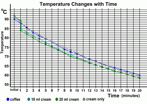 ![]() Observations and Conclusions: The blue line is the black coffee cooling curve. When you add creamer to the coffee, the temperature immediately drops, but not by a great amount. This is because we are only adding a small amount of creamer to the coffee, and it's not very cold. The amount of creamer added in each test (10 ml and 20 ml) was meant to simulate real conditions. Adding very cold creamer would increase the initial drop in temperature. This is additional testing that should be done to complete this experiment; every experimental result should suggest new things to check out. I didn't follow up on this, but you should in any experiment you do. The first thing I noticed in the graph above is that the cooling curves for all the samples are very similar, if not identical, after about only two minutes. Black coffee, coffee with creamer, or even straight creamer, all seem to cool at the same rate. The only difference is that in the samples with creamer added to coffee, the temperatures are always a few degrees cooler than the black coffee; however, the difference in temperature is only a few degrees ... not enough to notice when drinking ... and the difference gets smaller as time passes. Moreover, look at the curves for black coffee (blue) and straight creamer (grey). They are just about identical! The above observations led me to conclude that our hypothesis was incorrect. It doesn't matter whether you add creamer to your coffee or not ... the cooling rate will be the same after the first few minutes if you add the creamer a minute after you get the coffee. Waiting to add the creamer until you're ready to drink the coffee (maybe after 10 minutes) does not make sense, since at that point the temperature would drop well below that of coffee where the creamer was added at the beginning. To keep your coffee warmer longer, add the creamer within the first minute. (Note that this is not because coffee with creamer cools more slowly, as we guessed; it's because after 10 minutes or so there won't be much difference between the temperature of the black coffee and the temperature of the coffee with creamer added right away; adding creamer to the black coffee then will make it cooler than if you'd added it originally). Here's another place where additional testing should be done. I should have compared the temperatures of coffee with creamer added at the start to coffee with creamer added after 10 minutes or so. Don't be afraid to go back and do more testing to answer additional questions or back up your conclusions. The second thing I remarked on is how similar the cooling curves are for all the liquids. The thickness of the mixture seems to have had no noticeable effect on the rate of cooling, after a few minutes or so. Since you might expect some sort of difference to have occurred, it is now necessary to come up with some sort of explanation for this result. I suspect that the cooling rate does not change noticeably because creamer is mostly water; the difference in viscosity between coffee and even straight creamer is probably too small to affect the rate of cooling. This suggests some further research we might do to see if we're correct. We won't do it here, but it's something you should do in any experiment you conduct. |