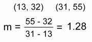 ![]() Finding the Equation of the Line This page will show you how to find the equation of the line of best fit. First we'll do the calculations on paper, using the point-slope formula. Then we'll show you how to make your TI83+ calculator do all the work! ![]() It represents data collected in an experiment, where we measured the mass of a solid that formed in a beaker after leaving it for a specified time. Each data point represents the mass of one sample (in grams) and the time it took to form (in seconds). The data generate a very strong positive correlation. In order to predict how much mass will be present after 250 seconds, we will draw the line of best fit and find its equation. Method 1: Using the Point-Slope Formula ![]() At the right you can see the line drawn. We did this by 'eye', so our calculations below will only be approximations. We've also identified two points; the points used must be on the actual line. First we'll use those points to find the slope m of the line: ![]() Then we'll use the point-slope equation to find the line's equation: ![]() Using the variables from the problem, the equation is: mass = 1.28 x time + 15.4 or M = 1.28·t + 15.4 We can now use this equation to predict the mass after 250 seconds: M = 1.28(250) + 15.4 = 335.4 grams . Remember: because there is some variability in where to locate the line of best fit, the equation for that line is only an approximation. This will always be true when the correlation is anything but perfect (ie: the points don't line up perfectly). However the equation does describe the direction of the points on the graph, and is useful for making predictions like the example above. |