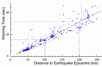 ![]() When an earthquake takes place somewhere, the first indication is the arrival of the fast-moving, relatively harmless p-waves; this is followed by the slower moving s-waves, which can cause the ground to move up and down violently. The time between the first p-waves arriving and the beginning of maximum ground shaking is called the warning time. Each point on this graph represents the warning time and the distance to a specific earthquake. You can see a strong positive correlation, which indicates that the further away an earthquake is, the longer the warning time. (In other words, when a distant earthquake occurs, there will be a longer time between the arrival of the first p-waves and the more destructive s-waves). For example, at a distance of 100 km, there is approximately 16 seconds of warning time between the earthquake onset and the arrival of the destructive s-waves. For an earthquake 200 km away, the warning time increases to about 32 seconds. |
