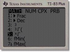 ![]() Your calculator will work out any type of root, not just square roots. For example, suppose you wanted to find the fifth root of 32: ![]() In order to do a root like this, you enter the index first. The index is the little number in front of the root sign that tells you what kind of root it is. In this case it's a 5, so type 5. Next, access the Math menu using the MATH key (yellow arrow at left). ![]() This is what you'll see on the screen: ![]() The '5' is out front, but it represents what the 'X' in the root sign is. It's a 5th root. Now type in the '32'; you'll see: ![]() This represents 'the fifth root of 32', and after pressing 'ENTER', the calculator will tell you the answer, which is 2. You can enter any index for any type of root, and the calculator will work it out for you, if it exists. Note: Even-number roots of negative numbers don't exist ... they are not Real numbers. If you try to do one (for example, the square root of -25), the TI83 will politely tell you that there is no such number, with this error message: ERR: NONREAL ANSYou can choose 'GoTo' to go back and change the question, or 'Quit' to start over. |