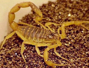 ![]() ![]() There are more than 1500 species of scorpion; all are arthropods in the class 'arachnida', and so are closely related to spiders, mites and ticks. Most have a life span of 2 - 6 years. All scorpions are venomous, although most are not dangerously so. There is even a scorpion found in Alberta. Scorpions hunt at night; their prey includes insects, spiders, and other scorpions. Larger species also prey on small lizards, snakes and mice. When a scorpion spots a victim, it will grab it with its claws, using its venomous tail stinger only if the prey is large or resists being eaten. If a human is stung by a scorpion, the usual symptoms are swelling, numbness and convulsions, as well as difficulty in breathing. Scorpion stings are rarely fatal to adults if medical attention is received. Children and older people are much more at risk of death, however. The Death Stalker Scorpion Lieurus quinquestriatus ![]() The Death Stalker scorpion is found in North Africa and the Middle East. It prefers a dry climate, and makes its home in natural burrows or under stones. The neurotoxins found in Death Stalker venom are being studied by scientists, who hope to find in them a treatment for some diseases, noteably some forms of brain cancer, and diabetes. |