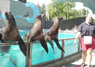 Sea lions, fur seals, seals and walruses as a group are called called pinnipeds, which are all aquatic carnivorous mammals with flippers instead of arms and legs. Their streamlined bodies and flippers allow them to move quickly through water. Sea lions, however, are quite different from true seals. The California sea lion, for example, has visible external ear flaps, unlike a seal (which just has ear holes), and the sea lion can walk on his front and back flippers (the seal just crawls). Adult females (shown at the left) are much smaller, growing to only about 160 kg (350 lb). Pups are born in June or July, and weigh 5 or 6 kg. They nurse from 6 months to a year. Pups are born with a black coat, which changes to brown after about three weeks. Sea lions in the wild may live up to 18 years. Those in captivity have been known to live 23 years or more. California sea lions can swim up to 40 km/h in short bursts. They often dive to depths of 100 metres, with recorded maximum dives reaching California sea lions are social animals, and congregate in large groups on the beach and while floating on the ocean. They are known for their intelligence, playfulness and noisy barking, and are easily trained. The body of a sea lion is so flexible that it can bend over backwards and just about touch its nose to the tips of its back flippers. California sea lions are warm-blooded mammals, with a thick layer of blubber to insulate them against the cold. Their short fur mainly serves to protect their skin when climbing out of the water onto rocks. Even on crowded rookeries, (beaches where thousands of sea lions congregate), California sea lion females and pups always recognize and can find each other. They accomplish this mainly through smell and sounds. They see much better underwater; on land they are somewhat nearsighted! Sea lions will eat whatever is available, including squid, octopus, herring, rockfish, smelt, hake and lamprey. Their only natural predators are Killer whales and Great White sharks, ... but man contributes to sea lion deaths through ocean pollution, illegal shooting, and entanglement in fishing nets. California sea lions can be found all along the Pacific coast from Vancouver south to the southern tip of Baja, California. Years ago there was also a population off the coast of Japan. Unfortunately, it was hunted to extinction. |
