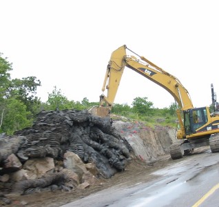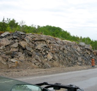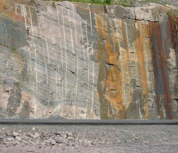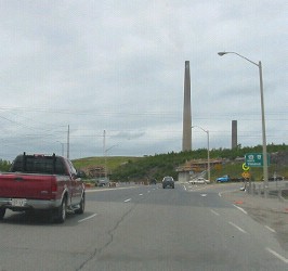 ![]() The shield is mostly thin soil lying on top of bedrock, with many bare outcrops and thousands of lakes. This was caused during the last ice age, when glaciers covered the area and scraped the rock clean as they moved. A few million years of advancing and retreating glaciers have actually carried pieces of the shield into southern Ontario and the northern United States ![]() The shield was originally a region of very large mountains and some volcanic activity, but over the millennia the area was eroded. Mountains have deep 'roots', and float on the denser mantle below. As mountains erode, their roots rise, and are slowly eroded as well. The rocks that now form the surface of the Canadian Shield were once far below the earth's surface. The high pressures and temperatures at those depths created many forms of minerals in the rocks. Since the end of the last ice age - 15,000 years ago in southern Ontario, but only about 6,000 years ago in northern Quebec - the land has become covered with a thick boreal forest of coniferous trees. Today, much of the Canadian Shield is home to mining industries of various sorts, as well as logging and other forestry-related industries. As you drive through northern Ontario, the Canadian Shield bedrock is clearly visible, especially in areas where the highway is being widened. Unlike in other regions where highway construction involves merely moving around a lot of dirt, in northern Ontario, making a road is a major undertaking! ![]() ![]() The hills are solid rock, and must be blasted literally to pieces with dynamite. This is not so easy when vehicles are passing by on the highway; construction teams spread huge 'blankets' of old tires over the rock face to be blasted, and traffic is stopped until after detonation. Then heavy equipment clears away the pieces of rock, which are used to fill in low areas. ![]() ![]() In the two pictures above, you can see how far down the surface rock had to be removed to make a level road. Clearly visible are the layers in the rock, layers that were folded in gentle curves millions of years ago by the intense heat and pressure deep underground. Also visible in these pictures are many vertical 'white stripes' in the rock that are actually the drill holes where dynamite was inserted to blast apart the rock. ![]() At the right you can see the final result ... a highway that cuts right through the top layers of the rock of the Canadian Shield. One unfortunate side-effect of building highways here is that the steep rock walls that the highway passes through don't allow for errors on the drivers' part ... if you go off the road at high speed, your accident will likely be fatal. The Canadian Shield stretches over much of Northern Ontario and Michigan. Despite being separated by Lake Superior, these two regions share many geological features, one of which is plentiful deposits of iron ore. The iron (actually iron oxide, or rust) in the exposed rocks colours them red in some regions. There is actually a town in Northern Ontario called Red Rock. The iron oxide in the rock also gets into the mix they use in both regions for asphalt, giving the highways in both places a red tint. The rock in northern Minnesota and Michigan, across Lake Superior, is the same. ![]() ![]() The largest Ontario city on the Canadian Shield is Sudbury. Sudbury is named after a town in England. Located just north of the Great Lakes, about 4 hours north of Toronto, the region is thought to be the site of an asteroid impact with the earth many millions of years ago, as the underlying rock contains a vast deposit of minerals. The small town of Copper Cliff (now a part of Greater Sudbury) is the location of a huge complex of mines, smelters, and refineries, which since the late 1800's have been in place to extract this mineral wealth from the ground. The area produces nickel, copper, silver, iron ore, and various other valuable minerals. I grew up there. When the area was originally settled in the late 19th century, most of the timber was cut down, a lot of it to fuel the giant smelters which melted the rock to allow the minerals to be removed. The fumes from these operations (which included the noxious and toxic sulphur dioxide) also served to kill off much of the remaining vegetation. For most of the 1900's the region around Copper Cliff was a barren wasteland of exposed rock, as well as slag (worthless rock) left over from smelting operations and dumped wherever it was convenient. Nevertheless, the region prospered, as there was a large world-wide demand for the metals being produced, particularly nickel. The city of Greater Sudbury became one of the largest cities in northern Ontario. Huge smokestacks, and later a single 'superstack', allowed much of the sulphur dioxide to blow somewhere else*, leaving the air reasonably clean, and allowing vegetation to return. In recent decades, both the city and the principal mining company have undertaken a reclamation project, in which topsoil, grass and trees have been put in place over the rock and slag dumps. ![]() ![]() I visited Sudbury and Copper Cliff during the summer of 2004 to see how it had changed since I was growing up there in the 50's and 60's. Despite the fact that the region's mines and smelters are no longer the biggest or most productive in the world, the region has definitely continued to prosper. The greening program has created a startling transformation ... there is grass and vegetation everywhere! The picture at the left just above shows what was once a huge slag dump area, barren of everything except crushed rock. it is now (at least, as seen from the highway) a pleasant vista of green rolling hills and trees. The picture at the right is a typical small street in Copper Cliff, with the superstack visible in the background. Since this stack went into operation, the town seldom has to put up with the clouds of sulphur dioxide that used to make just breathing an unpleasant experience. There are m