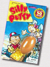 However, no immediate practical use for the material was found. It wasn't until 1949 when an unemployed ad executive came across the strange substance at a party. He saw its potential as a children's toy, and bought the production rights. He began producing it, renaming it it Silly Putty, and packaged it in plastic eggs 'because Easter was on the way'. Soon, Silly Putty was a sensational, multi-million-dollar seller. Ironically, only after its success as a toy did more practical uses for the substance appear. It picks up dirt, lint and pet hair, and can stabilize wobbly furniture; it can be used in stress-reduction, and physical therapy for the hands. It can be sculpted. The crew of Apollo 8 even used it to secure tools in weightlessness on their way to the moon. In 1990, the company that manufactures Silly Putty added four fluorescent colors -- magenta, orange, green and yellow. In 1991, 'Glow in the Dark' Silly Putty became available, and eventually was released in gold and silver colours. Here are the ingredients of commercially available Silly Putty: