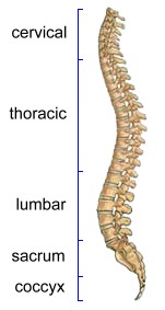 The Spine![]() This alternating stack of bone and cartilage helps protect the nervous system's spinal cord, a bundle of nerves which connect the entire body to the brain, and which runs up through the centre of the spine. As you can see from the diagram at the right, the spine is naturally curved; the curves help to distribute mechanical stress as the body moves. The spine also has different regions, based on what part of the body it is in. The cervical vertebrae form the neck. The thoracic vertebrae are in the upper back, and contain the connections to the ribs. The lumbar vertebrae are centred in the lower back, and are the largest, since they carry most of the body's weight. The sacrum and coccyx (tail bone) form the bottom of the spine. The vertebrae of the spine are held together by two thick ligaments that run the entire length of the spine, and by smaller ligaments between each pair of vertebrae. Several sets of muscles are also attached to the vertebrae, which help to both support the spine and allow it to move. |