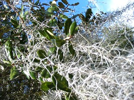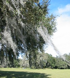 ![]() ![]() It seemed to be everywhere, not only covering the trees, but also hanging from telephone wires, fences, and occasionally even roofs. A local resident informed us that this was Spanish Moss. Not being familiar with this type of plant, we immediately assumed it must be some sort of parasite. Is it really a moss? Does it live on nutrients it receives from the trees? What does it look like up close? We did a little research, and were amazed at what we learned. We'll share it with you here, along with some pictures we took of this amazing plant. The first thing we discovered is that Spanish Moss is not a true moss at all, but is actually more closely related to the pineapple tree! Moreover, it is not a parasite! While it clings to the tree for support, it is not directly attached, and receives no nourishment from the tree. Rather, Spanish Moss is an epiphyte. Epiphytes do not draw nutrients from the host plant, but absorb water and food from the air directly though their stems and leaves. Through the process of photosynthesis, just as in ordinary plants, the chlorophyll in the epiphyte converts water and CO2 into carbohydrates. Other examples of epiphytes include some tropical orchids, and some ferns. Spanish Moss can be found in the U.S. from Virginia southwards, and all the way down to Argentina in South America. Native Americans called the plant 'tree hair', a name which the French explorers turned to 'Barbe espagnole', or 'Spanish Beard', to insult their Spanish rivals in the New World. The Spanish in turn named it 'Cabello francés' ('French hair'). 'Spanish Moss', a milder variation of the French insult, has survived. Another common name is 'Graybeard'. Small stems grows after about two weeks, and these stems will extract most of the plant’s nutrients from its surroundings. The plant will also absorb some nutrients from matter that has decayed on the tree. The plant’s external scales may also absorb minerals from tree leaves. A host tree may suffer if a particularly thick growth of moss blocks out sunlight, but Spanish Moss normally does no harm to the trees it hangs from. However, Spanish Moss can absorb water up to ten times its own weight, and will often crack the branch on which it has grown after a particularly heavy rainfall. Strangely, despite the fact that the plant does not physically attach itself to trees, the moss will grow only on trees, and not on fences, telephone poles, buildings or even on vines; whatever clumps of Spanish Moss happen to be found on these surfaces have fallen there, or have been blown from trees by the wind. Spanish Moss creates an ecosystem that shelters many creatures, including chiggers, rat snakes, and three species of bats. One species of spider, Pelegrina tillandsiae, lives only in Spanish Moss. We weren't aware of this when we were examining strands of the moss and taking these pictures; fortunately the strands we held seemed to be free of inhabitants! Birds also use Spanish Moss to build or hide their nests, and the parula warbler makes its nest in the actual hanging clumps of the moss. Squirrels, owls, egrets and mockingbirds also use Spanish Moss for nest bedding. Colonists also mixed moss and mud together to make the walls of their cabins. Dried moss also made good kindling for the fireplace. Commercial uses for Spanish Moss have included packing material, saddle blankets, bridles, braids, and twine to repair fishermen’s nets. Apparently Henry Ford stuffed the seats in his first Model Ts with Spanish Moss. Nowadays, Spanish Moss is mostly used just for arts and crafts. But scientists have also discovered that testing samples of the moss, especially ones that hang near major highways, can measure how much air pollution exists, since the plant will absorb such heavy metals as lead, copper, nickel, and manganese from the air along with its nutrients. |