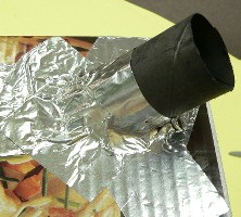 ![]() A spectroscope is a device that splits a light beam into the different wavelengths contained in the beam. By passing the light from a glowing gas through a thin slit and then causing it to split, you will see images of the slit at all the different wavelengths emitted by the atoms in the gas. This technique can be used to identify substances, since every atom emits light at different wavelengths. ![]() The idea for this project came from the excellent book "Gonzo Gizmos" by Simon Field, which contains a variety of projects in physics and electricity. It can be ordered from his website www.scitoys.com, where you can also find all sorts of scientific devices and materials; we highly recommend it. The spectroscope we will build uses two single-edge razor blades to form the slit. These can be purchased in most hardware stores (they're used for scraping paint). The light will be split by a music CD, which contains many finely etched lines side by side. (A prism would also work, but the construction would be more difficult). We'll view the split light beam through a cardboard tube; all of the pieces will be mounted inside a small box. ![]() ![]() ![]() You'll also need some aluminum tape (not duct tape) to seal the box, making it light-tight. (You can also use aluminum foil and tape). A sharp knife will be needed to cut the holes, and some tape is necessary to attach things. A pencil/pen will be used to mark the holes for cutting. We also sprayed the inside of the box and tube with flat black paint to cut down on reflections. First let's locate the hole for the viewing tube. We'll use the CD as a guide, placing it along the bottom edge of the box at the left, and marking an 'X' at the centre. Now trace around the end of the tube, centred on the 'X'. Next, slide the end of the tube about a centimetre to the right and make another circle. Use these two circles to cut out an oval shape. This will allow the tube to enter the box at an angle. ![]() ![]() ![]() ![]() Now turn the box to the left, and once again place the CD along the bottom edge, at the left, and mark an 'X' at the centre. Cut out a 4cm x 1cm slit centred on this 'X'. ![]() ![]() ![]() Make the sharp edges nearly touch, leaving a narrow opening that's the same width all the way down. Be sure not to put any tape over this opening between the blades. ![]() Next, tape the CD to the back wall of the box, with the label side touching the wall. The light entering from the slit needs to hit the centre of one side of the CD, and then reflect into the viewing tube. When testing the spectroscope, we found that we had to open up the box and move the CD slightly to get the image centred properly. This could also be accomplished by changing the angle of the viewing tube. The final step is to seal all cracks and openings with the aluminum tape. The box must be completely light-tight, except for the viewing tube and slit. (If you want to improve the appearance of your spectroscope, you might also spray-paint the entire box ... just be sure not to get any paint in the slit between the razor blades). ![]() ![]() ![]() ![]() Go on to page two and we'll show you some photographs of light spectra we obtained with our spectroscope. We'll also tell you what a spectroscope is used for. |