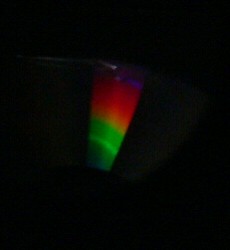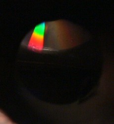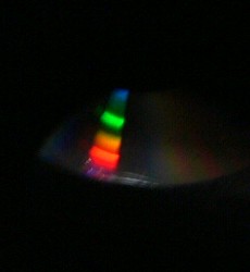 ![]() When you point the end of the box with the slit in it at a source of light, the light beam will enter the box, reflect off the CD, and exit through the viewing tube. The many fine lines on the CD, which act as a diffraction grating, cause the light to disperse, or spread out. (The same effect can be caused by sending light through a prism). Each of the different wavelengths that were in the original beam bend by a different amount. When you see this 'split-apart' beam in the viewing tube, you will see all these different wavelengths that were in the original light. ![]() Because sunlight contains all the wavelengths of visible light, light from the sun will split into a continuous spectrum of colours, like a rainbow. [DO NOT aim the spectroscope at the sun; even a reflected image of the sun will damage your eyes]. This is also true for light from ordinary incandescent light bulbs, where the light comes from the glowing metal (tungsten) filament. At the right is a photo taken through the viewing tube of our spectroscope, which was pointed at a bright incandescent light bulb. A continuous spectrum (rainbow) is clearly visible. (We didn't enhance these photos in any way; the image was clear and easy to photograph. Focusing while simultaneously holding the box and pressing the shutter, however, was somewhat tricky). Non-Continuous Emission Spectrum When a glowing gas gives off light, the light comes from the atoms that are in that gas. Every type of atom gives off a unique wavelength of light when its electrons fall into place. Examining the spectrum from a glowing gas will show bright lines at any wavelength where light is being emitted. That's similar to what happens inside a fluorescent light. Some of the light produced is broad-spectrum, so you'll still see the full rainbow. But gas in the fluorescent light glows at a wavelength characteristic to that gas, and will show up as bight bands in the spectrum. Below are two spectra from fluorescent lights. The first one is from common overhead long fluorescent tubes, the kind that are in every school. There is a clear band of light in the green area corresponding to a gas emitting light inside the tube. The second one is from a small fluorescent bulb in a document viewer, which gives off bright white light; more than one band is visible here. ![]() ![]() ![]() The photo at the right is the spectrum of the light from the LCD display screen of a laptop computer. The screen was set to white, and then the spectroscope was used to spread the wavelengths apart. The spectrum clearly shows that the light produced by the tiny crystals on an LCD screen is made from just three or so different wavelengths. Additional light sources you might want to look at through your spectroscope might include the flame from a butane lighter, or the flame from a laboratory gas jet. In either of these cases, adjust the flame so that it is mostly blue, so you'll get the light from the burning hydrocarbons. Uses for a Spectroscope You can identify an unknown material by burning some of it! By first making spectrum photos of all the single-element gases (like for example, argon or neon), you can use them to compare to the spectrum of an unknown sample. This will let you identify what gases must be glowing in the sample by the bands that are produced. Another interesting and useful phenomenon is that any gas between you and the glowing light will absorb some of the light at wavelengths characteristic to that gas, producing dark bands in the spectrum. As a result, the spectrum of ordinary sunlight isn't really continuous (despite what we told you earlier). As light from the sun passes through cooler upper layers of gas at its surface, some of the light wavelengths are absorbed by these gases. The actual spectrum of the sun, examined in detail, shows many such dark bands, each corresponding to an element in the sun's surface. ![]() It was by examining these dark bands (called Fraunhofer lines after their discoverer) that the composition of the upper layers of the sun was first determined. Using both bright bands from emitting atoms and dark bands from absorbing atoms, scientists have also been able to determine the chemical composition of stars and interstellar gases (which are thousands of trillions of kilometres away) by passing star light through a spectroscope. |
