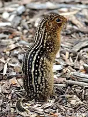 ![]() The thirteen-lined ground squirrel is strictly diurnal and is especially active on warm days. In late summer, it puts on a heavy layer of fat and stores some food in its burrow. It enters its nest in October, rolls into a stiff ball, and decreases its respiration from between 100-200 breaths per minute to one breath about every five minutes. It emerges in March or early April. Thirteen-lined ground squirrels prefer open areas with short grass and well-drained sandy or loamy soils for burrows. They avoid wooded areas. Mowed lawns, golf courses, cemetaries, well-grazed pastures, parks and roadsides are common habitats. The burrow may be as much as 6 metres long, with several side passages. Most of the burrow is within half a meter of the surface, with only the hibernation nest in a special deeper section. Shorter burrows are often dug as hiding places to evade predators. The animal is well camouflaged, and frequently stands to keep watch. ![]() When preparing for winter hibernation, Thirteen-lined ground squirrels put on a lot of extra weight in the form of fat, so they can survive without eating for six months. Thirteen-lined ground squirrels have excellent senses of vision, touch, and smell. They use alarm calls and other sounds, as well as using special scented secretions, to communicate with other squirrels. They rub glands around their mouth on objects to leave scent marks. They also greet one another by touching noses and lips. This ground squirrel's home range is about 1 hectare (2-3 acres). Thirteen-lined ground squirrels give alarm calls when they sense a predator; all nearby squirrels escape into their burrows. This squirrel's main predators include snakes and hawks. Up to 90% of newborn Thirteen-lined ground squirrels die from predators in their first summer. Once they have reached adulthood, these squirrels probably live for only a few years. |