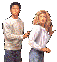 ![]() ![]() Steve came in from the yard, struggling to close the kitchen door against the wind and snow that were blowing hard. He threw his coat and cap on a chair by the table, and sat down heavily. "Did you find him?", Jennifer asked. She watched as he poured himself a cup of coffee, stretched out his legs, and took the first sip. "No, but I'm sure it was him. It's just like something that jerk would do!" Steve got up and went to the window. He was tall...just over six feet, and carried a lot of muscle on his thin frame, although you wouldn't know to look at him, Jennifer mused, as she watched him peer out the window. Steve returned to the table, but didn't sit down. Instead, he said to Jennifer "I just don't understand why he'd do this tonight...he knows you're here, and what you've been through. I'll kill him!" Jennifer watched him walk back to the window. As he looked out once again, she reflected that Steve might not get the chance...not if she got there first! Steve's so-called friend David was known for some pretty stupid practical jokes, but this one wasn't funny. In fact, she thought to herself, if Steve weren't here, she'd probably be completely freaked out by now. Hiding under the bed, or something. Well, a little frightened, anyway. Jennifer and Steve were both high school students, and both in their last year. They'd been going out for several years now, and were planning to enroll together in college in the fall. Last month Jennifer's home had been broken into while she was there...she had hidden in the basement while the theives ransacked the house above her. She'd been terrified they would come down into the basement and find her, but had left quickly when a neighbour had driven into the yard looking for her father. The experience had left her a wreck...she didn't like being alone, and was on edge all the time. She especially didn't like strange noises...and certainly not the kind of noises she'd heard tonight, somewhere out in the yard. It had to have been David, though. Steve was pretty sure about that. "Tell me again what you heard, Jenn" Steve said, as he returned to the table and sat down next to her. "O.K. Well, it was just after I'd gotten here...you were upstairs. I'd found the note from your mother, saying they'd gone out for dinner, and was putting the coffee on...over there by the window." "How dark was it outside?" Steve interrupted. "Not very," Jennifer continued. "But with the wind and snow blowing around, you couldn't see very much of anything. And then I heard it...several times. It sounded like, oh, I don't know...maybe some kind of small animal. There were these low moaning noises, and then this laugh..." She shuddered. "That laugh...it was horrible. Like somebody was crazy, or something. You know? Like the person was in pain, but enjoying it. Does that make sense?" Steve looked at her closely. Her long brown hair outlined her face, a face pale with worry and concern. Jennifer was a beautiful girl, and Steve didn't like to see her this way. "Are you sure it wasn't an animal?" "No way...that laugh was human! Steve, I'm scared!" When Steve had come downstairs, he'd seen Jennifer at the window, and when she turned, the look on her face was like nothing he had seen before. This thing was really getting to her. He had immediately suspected his friend David, who was known for this kind of stunt. But after a quick trip outside, he wasn't so sure anymore. It was cold out there. And while David wasn't above an elaborate stunt, Steve didn't think he'd pull something like this with the wind and snow that was out there. Which left what?...an animal? The two of them looked at each other. Suddenly Jennifer smiled. "I hope it is David", she said, with a slightly wicked look in her eyes. Steve had seen that look before. He smiled too. "I can picture him, out there in a snowbank somewhere, snickering about how he's scared us, but freezing his sorry ass!" Jennifer chuckled. "I hope the wind picks up some more." Steve laughed, and took her hand. It was good to see her brighten up; she had had a few rough weeks. "All right, let's just leave him out there. How about..." At that moment, the lights went out. With a gush of icy wind, the back door blew open. Snow was blowing into the darkened kitchen, in glowing swirls of snowflakes. Just beyond the door something was visible,... not quite human, not quite animal. Steve held Jenn's cold and clammy hands in his. Unable to move, they both stood frozen in fear. Jenn was the first to speak. " Steve... wwwhat is that?" she said in a whisper that could hardly be heard above the wind. All that he could muster was a weak, hoarse "David? David.. is that you? Stop this, right now!" Steve let go of her hand, and started to move forwards. Just then a dim light, seemingly from far in the distance, illuminated the floor near the open door. Not knowing its source, Jenn shivered, and reached out for Steve, but he wasn't there. She screamed. Frantically, she lunged for the basement door. A sudden, terrifying thought entered her mind. "What's happening?!?" Can this be the man who broke into my house last month? Is he out there again now?" She found the knob to the basement stairs. As her hand wrapped around it, she felt the handle begin to turn from the other side. With a sob, she turned and ran into the living room. Someone was in the house with them. She needed a place to hide. Quickly she moved around the familiar room, feeling for the couch in the near darkness. As her hands encountered its soft leather bulk, she knelt down and squirmed her way behind the massive piece of furniture. In the kitchen, the pale blue light shimmered in the doorway, and went out. She trembled with fear as footsteps started toward the living room. She searched for something to protect herself with. Soon her hand touched something. It was a sharp letter opener. She clutched it tightly in her hand as the footsteps grew louder. As they approached the couch she pounc