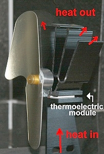 ![]() ![]() ![]() The fan generates its own electricity due to the difference in temperature between the top of the stove and the top of the fan. The base of the fan sits on the hot stove, at a temperature of 65°C or hotter; meanwhile, the top of the fan is much cooler due to the cooling fins, which radiate away heat. When the thermoelectric module in the fan experiences this heat differential, it generates electricity, which causes a small motor to turn the fan. In order to understand the conversion of a heat difference into electricity, we'll look at the thermoelectric module in more detail, and discover how a semiconductor works. A semiconductor is a crystalline metal with impurities added to it. (This is called 'doping'). These impurities can either add free electrons to the substance, or add 'holes' where electrons can be accepted. For example, silicon crystal doped with boron creates an n-type semiconductor with extra electrons; doping it with phosphorus atoms results in a p-type semiconductor that accepts electrons. ![]() ![]() When a temperature difference exists between the two semiconductors, a continuous current is formed in the conductors if they form a complete loop. The heat source drives electrons in the n-type element toward the cooler region, creating a current. Holes in the p-type element will 'flow' in the direction of the current. This current is what powers the motor. ![]() Summary: When two different semiconductors (n-type and p-type) at the same temperature are connected together they establish an electric potential difference, or voltage. When a temperature difference is applied, heat flows across the joined semiconductors; this causes electrons to flow. The resulting current powers the fan's motor. |