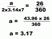 We know the radius r is 7 m, and the central angle x is 26°. Pi is of course 3.14.