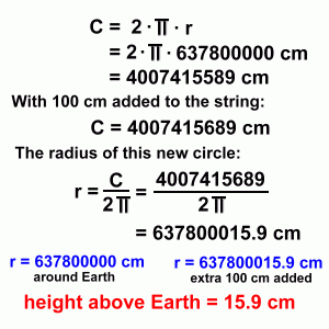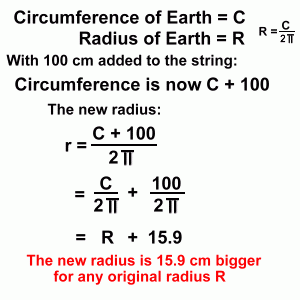 ![]() A String Around Earth: ![]() ![]() Here are the calculations that show the height of the string above the Earth, after you add one metre. We first worked out the circumference of the Earth, which will be the length of the original string. It's 4,007,415,589 cm. Next we added 100 cm, making the length of the string 4,007,415,689 cm. Finally, we solved for the radius of this new bigger circle. When compared to the original radius, you can see that the difference is in fact 15.9 cm. (The value we used for the size of the Earth wasn't precise ... but since the size of the sphere is irrevevant to the answer, we really can use any degree of accuracy we want, as long as we carry enough decimal places to make the difference show up). A String Around a Basketball: ![]() ![]() Here are the calculations that show the height of the string above a basketball, after you add one metre. We first worked out the circumference of the ball, which will be the length of the original string. It's 94.24777961 cm. Next we added 100 cm, making the length of the string 194.24777961 cm. Finally, we solved for the radius of this new bigger circle. When compared to the original radius, you can see that the difference is once again 15.9 cm. (The value for the size of the ball wasn't precise ... but since this number is irrevevant to the answer, we really can use any degree of accuracy we want, as long as we carry enough decimal places to make the difference show up). A String Around Any Sphere: ![]() ![]() We'll make the radius R, and the circumference C. This will be a proof that it works for any values of these measurements. We added 100 cm to the circumference, making the new longer length of the string C+100 cm. Next, we solved for the radius of this new bigger circle. After some simplifying, you can see once again that the new radius is bigger by exactly 15.9 cm. Bcause we did this without specifying values for R and C, it is a proof that it will work for any sphere. |