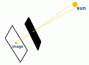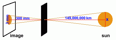 ![]() ![]() To measure the sun's size, you will need a stiff piece of very light cardboard, a sheet of white paper, a pin, a ruler, and a calculator. Before we start, though, we should caution you: Never ever look directly at the sun with your eyes, or through a telescope, camera, or sunglasses. Staring at the sun for even a few seconds can permanently damage your eyes. Not only are we going to measure the sun, but you'll learn a safe way to look at an image of the sun without damaging your eyes. The first thing you need to do is use the pin to make a tiny pinhole in the centre of the cardboard.This pinhole will act as a tiny camera aperture, letting the light from the sun through and making an image of the sun on your piece of paper. In fact, pinhole cameras were the first sort of camera invented a century or two ago. When you hold up the paper you will see a tiny perfect image of the sun, just like a photograph! ![]() As you move the pinhole farther away from the paper the image gets bigger; we chose a distance where the sun image was big enough to measure its width reasonably accurately. A second person is needed to measure the distance of the paper from the sheet with the pinhole. We wanted to see what kind of results we could get with quick, simple measurements, so we weren't too careful about measuring the distance exactly between the pinhole and the image. A more accurate result might be found by using stiffer cardboard. At 30 cm (300 mm) between the two sheets of paper, the image of the sun on the white sheet was about 3 mm across. Now let's do the calculation ... ![]() Here is the diagram with all the measurements marked. We know that the distance to the sun is about 149 million kilometres. To make the diagram clearer, we've exaggerated the width of the sun's image, and of course shortened the distance to the sun. ![]() Note that the units on the same side of each side of the proportion (pair of equal fractions) must be the same, but the units can be different on opposite sides. Cross-multiplying and solving gives a result of 1,490,000 km for the width of the sun. How close did we come? Remarkably, with very little effort and not much thought to precision, we obtained a result for the diameter of the sun which is close to the actual value of about 1,390,000 kilometres. We were off by just 7%! |