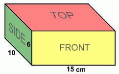 ![]() ![]() Lets look at some examples and we'll show you several ways to find the surface area. Rectangular Prisms ![]() In order to calculate its total surface area, you first have to realize that this figure has six faces. At the moment you can only see three of them. Let's redraw the figure so that it is transparent. This will allow us to see all six of the faces. ![]() Each of these two faces is a rectangle. You already know how to calculate the area of a rectangle: the formula for a rectangle's area is given by A = L · W Front area = L · W = 15 · 6 = 90 cm2 Back area = L · W = 15 · 6 = 90 cm2 ![]() Here are the left and the right. These two faces are identical. Each of these two faces is a rectangle. Left area = L · W = 10 · 6 = 60 cm2 Right area = L · W = 10 · 6 = 60 cm2 ![]() Here are the top and bottom. These two faces are identical. Each of these two faces is a rectangle. Top area = L · W = 15 · 10 = 150 cm2 Bottom area = L · W = 15 · 10 = 150 cm2 Now the total surface area of the figure can be found by adding the areas of all six faces: Surface Area = 90 + 90 + 60 + 60 + 150 + 150 = 600 cm2 You may have noticed that for the three area calculations above (each one of which is doubled up), the numbers used for the length and width were just the three measurements of the prism, taken in pairs. If you can see how this works, and would like a quicker way to calculate the surface area of a rectangular prism, here's a formula that always works, and will give you the answer in one step: Surface Area of a Rectangular Prism = 2·L·W + 2·L·H + 2·W·H S. A. = 2·15·10 + 2·15·6 + 2·10· 6 = 600 cm2 ... where L, W, and H are the length, width and height of the prism. Make sure your teacher will allow you to use this formula for your work; in grade 7/8 classes you may be asked to calculate surface area step-by-step instead, like we did at the top of the page. Now let's do another example with a different kind of prism ... |