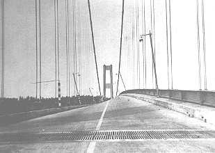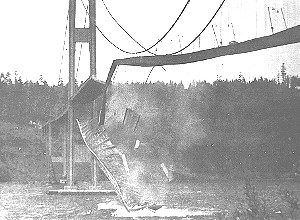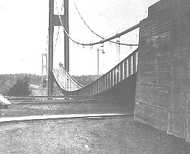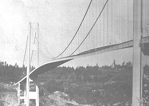 On November 7, 1940, at about 11:00 am, the first Tacoma Narrows suspension bridge, the third longest of its kind in the world at the time, collapsed. Situated on the Tacoma Narrows in Puget Sound, near the city of Tacoma, Washington, the bridge had only been open for traffic for a few months. Even in that short time, the bridge had become known for its violent oscillations during high winds. On November 7, these oscillations became sufficiently large to snap a support cable in the centre of the bridge, and the unbalanced load that was created caused the bridge to begin twisting in the wind, which eventually led to the bridge's collapse. Bridge designers in the mid twentieth century had been using steel trusses for stiffening in bridges, and the immense weight of all that steel made most bridges so stable that the designers were unaware of the effects of wind. When heavy railroad traffic began to decline and automobile traffic increase, many more bridges were needed, and the lighter loads presented by road vehicles allowed designers in turn to build much lighter bridges. The Tacoma Narrows bridge was built using very light sheet steel beams, and the weight of these was considered sufficient to damp out any vibrations caused by wind. They were wrong. The winds in Puget Sound were sufficient to make the bridge bounce up and down ... a lot. All by itself, this kind of vibration wouldn't have hurt the bridge. But a support bracket on the centre span slipped during one series of vibrations, causing the center cables to loosen. This immediately resulted in severe twisting motions as the wind continued to gust, which soon caused the bridge to break up. The collapse of the Tacoma Narrows bridge was due to a combination of factors. Its light weight and narrow structure made it prone to resonance ... a vibration in synch with the 42 mph wind gusts (much like pumping a playground swing to make it go higher). Severe turbulence on the leeward side of the bridge may also have been a factor. Architects and engineers today recognize the importance of analyzing a structure aerodynamically, to predict how it will behave in severe winds. This is done using wind tunnel tests on models, and by mathematical and computer modelling. In 1950, a new 18 million dollar bridge opened on the site of the first Tacoma Narrows Bridge. Tested in wind tunnels, the four-lane deck has 8 metre deep stiffening trusses that form a box, a design that resists torsional (twisting) forces. There are also hydraulic dampers at the ends to control vibrations. Visit our Bridge Building section. |