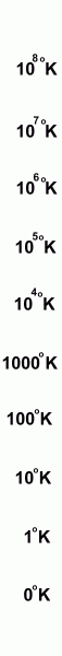 Now lets look at some of the interesting points on the scale above. Most of the natural temperatures that occur on the surface of the earth are in the green band. Nowhere does it get cold enough to drop into the blue. (The coldest-ever recorded temperature was -70 deg C, or 203 deg K). Lava from volcanoes may be into the yellow band slightly.