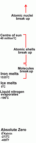 When temperatures reach tens of thousands of degrees C, atoms begin to be ripped apart; the electrons and nuclei flow together as 'plasma'. Eventually, when the temperature reaches many hundreds of millions of degrees, the nuclei themselves come apart. This only happens in the hottest stars where the pressure is also very high.