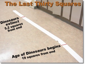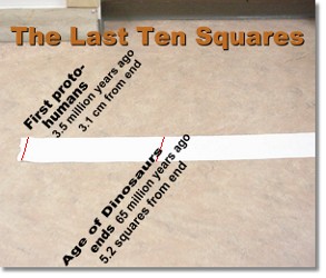 ![]() The earth is over 5 billion years old. Life first originated in the oceans 3.4 billion years ago. The dinosaurs died out 65 million years in the past. Human recorded history stretches back 10,000 years in time. These numbers are too large to visualize, and difficult to compare. Here's an easy way to put time in perspective, and actually visualize different eras in the earth's history. You'll need a roll of toilet paper, a long hallway, and some sticky notes. Unroll the full roll of toilet paper down the hallway. We found that our roll contained 400 squares, and each square was slightly over 11 cm long. (Do all brands have 11 cm squares? Better check this!) The earth is about 5 billion years old. That makes each toilet paper square equivalent to 12.5 million years; each billion years of earth's history takes up 80 squares of toilet paper. On this scale, one year is represented by 0.00000088 cm ... a width too tiny to see. But we can certainly visualize the past 10,000 years of recorded history on this scale, and compare it to the other events in earth's history. Once the paper is completely unrolled, you can mark these important events in earth's history at the appropriate points: