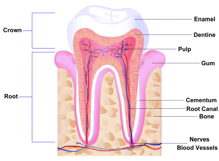 What’s inside a tooth? As you'll see in the diagram below, there are two main parts to a tooth: the part you can see, which is called the crown, and the part below the gum line, which is called the root.
