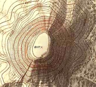 at that level. For example, you can see a line that says '4700'. All along the path of that line the elevation is 4700 feet (above sea level). As you get closer to the peak of the mountain, the elevation increases past 5000 feet; the top elevation is marked with an 'x' and is 5117 feet.