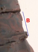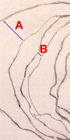 On our map, each line represents an increase in elevation of 1 cm. Have a look at the pictures above. In the picture on the left, you can see an increase in height of 1 cm at a spot where the slope is quite shallow. The side of the mountain isn't very steep ... we labelled it 'A'. Because there is a fairly large horizontal distance covered as you move up the slope 1 cm, the distance between the lines on our map should be large; have a look at region 'A' on the map.